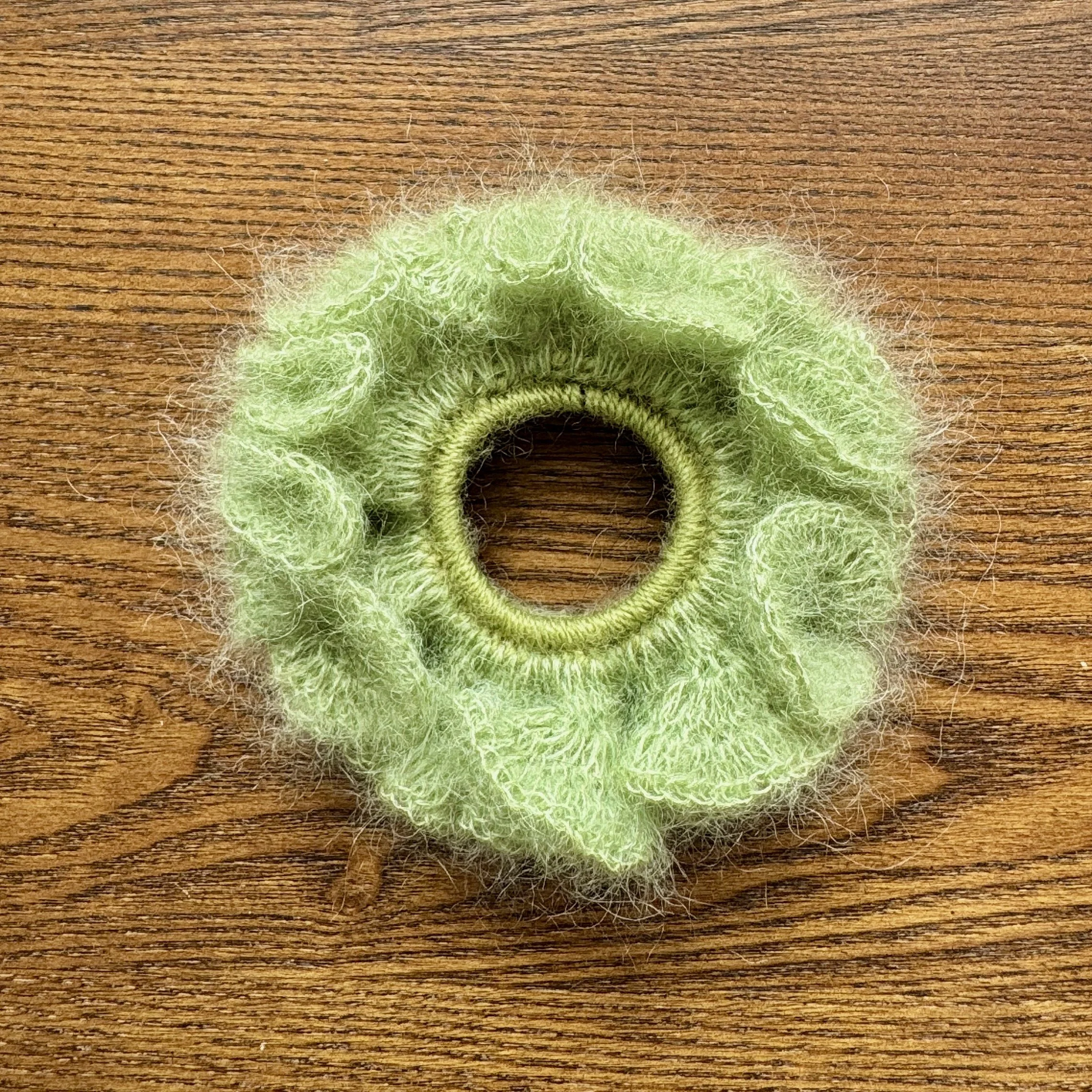 A handcrafted crochet ruffle scrunchie made with mohair and silk yarn, creating a gorgeous, fluffy texture.